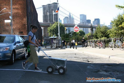 Not to be left out, of course, New York has its own project in this vein, called High Water Line, charting a ten foot sea-level rise around Brooklyn and Lower Mahattan. (I found this via Bruce Cahan at Stanford). HighWaterLine was initiated by artist Eve Mosher, in partnership with The Canary Project (global warming never looked so pretty!) and she's been blogging its progress since April 02007. Mosher elegantly outlines its philosophy at her website: